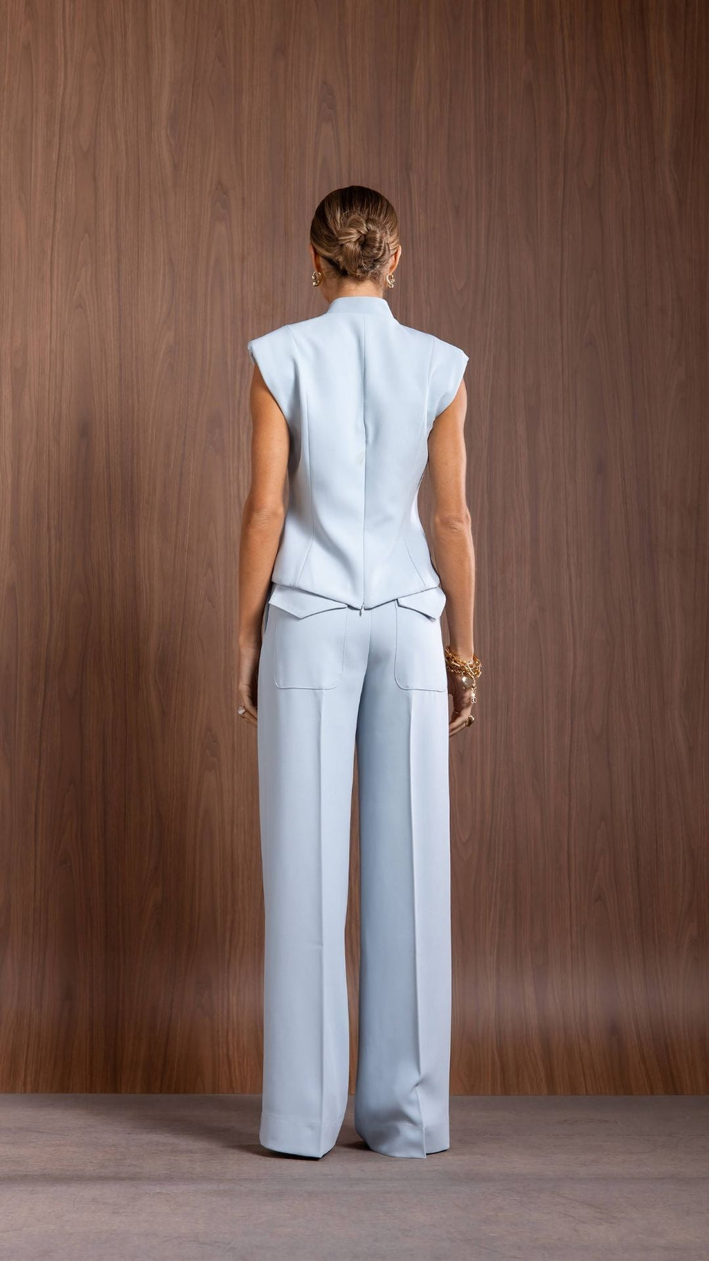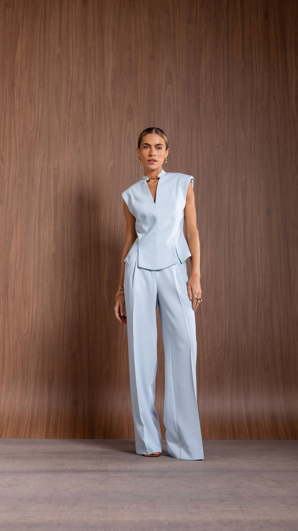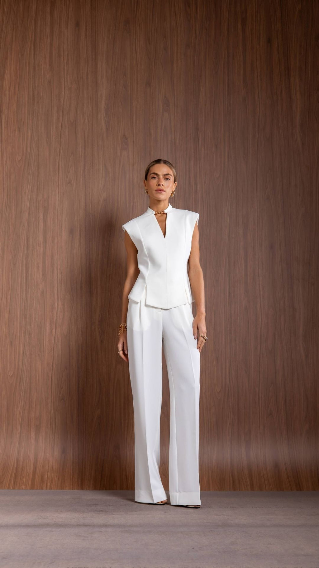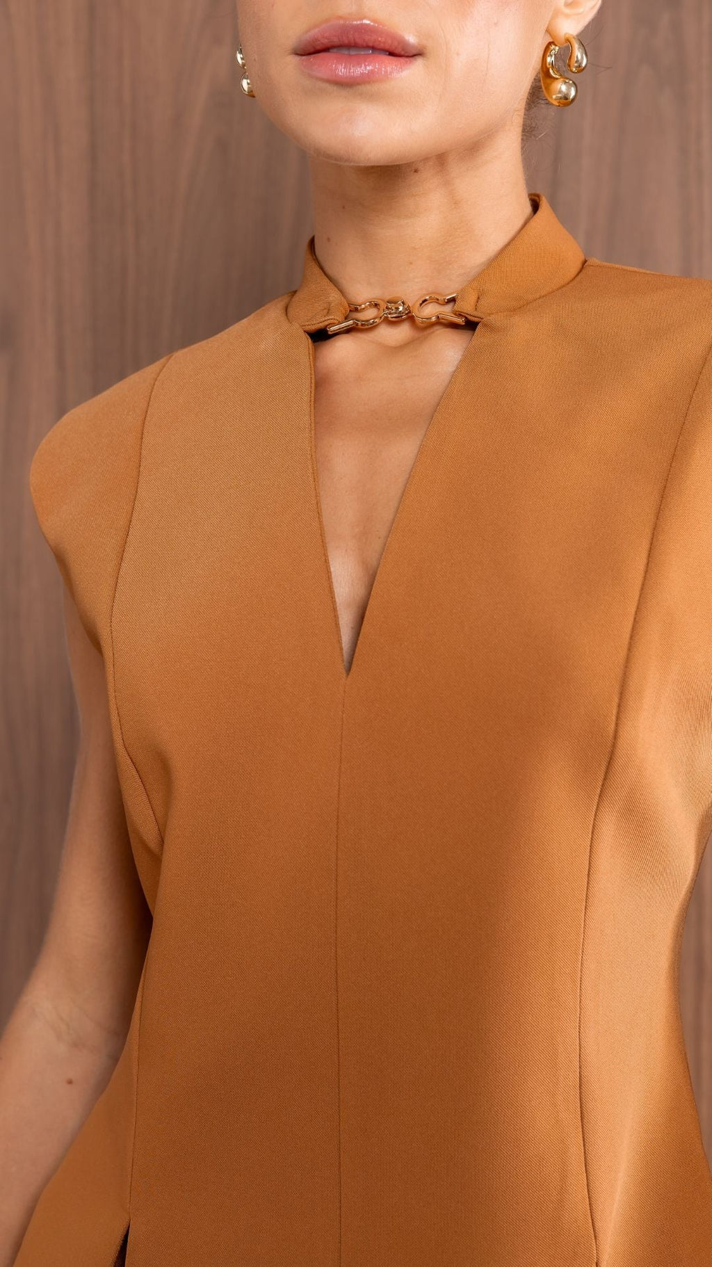 Modelo estruturado com shape sutilmente acinturado, decote em V com detalhe de ferragem, ombreiras discretas e recortes assimétricos na barra.