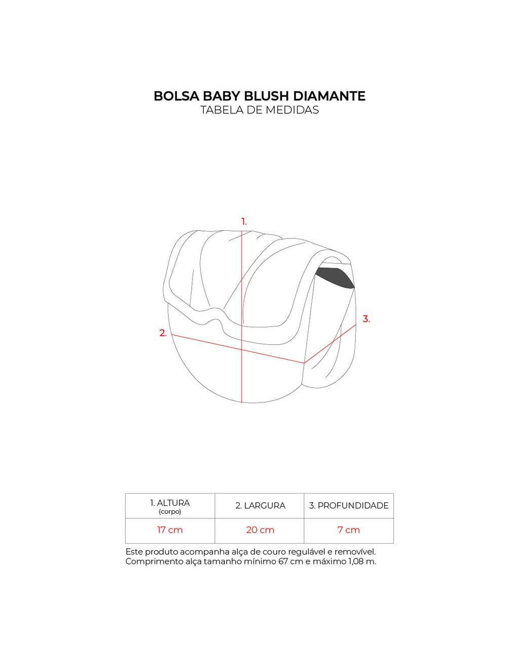 Acompanha alça removível e regulável, podendo chegar no comprimento mínimo de 0,75cm e comprimento máximo de 0,130cm