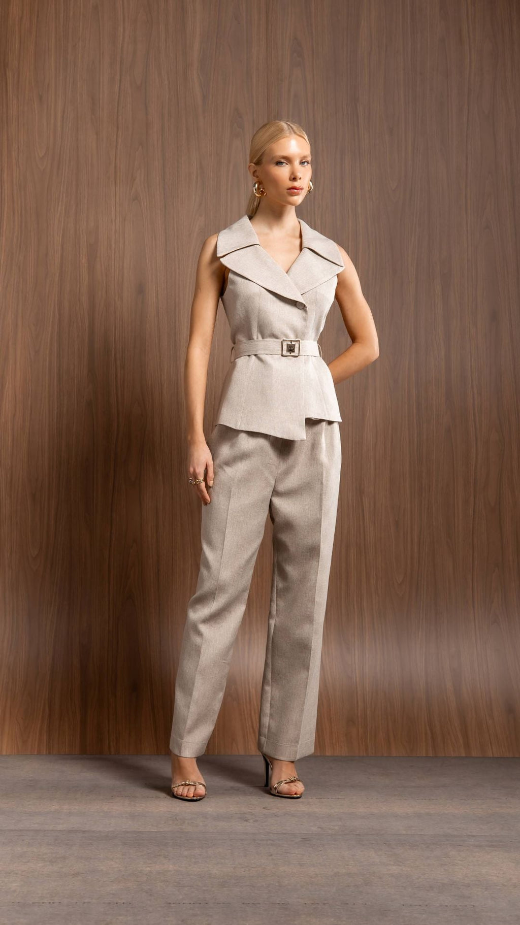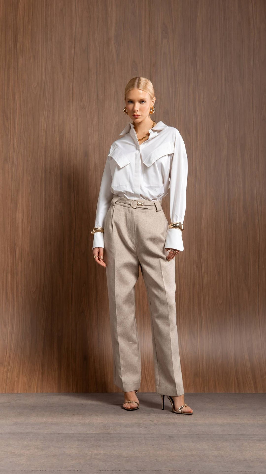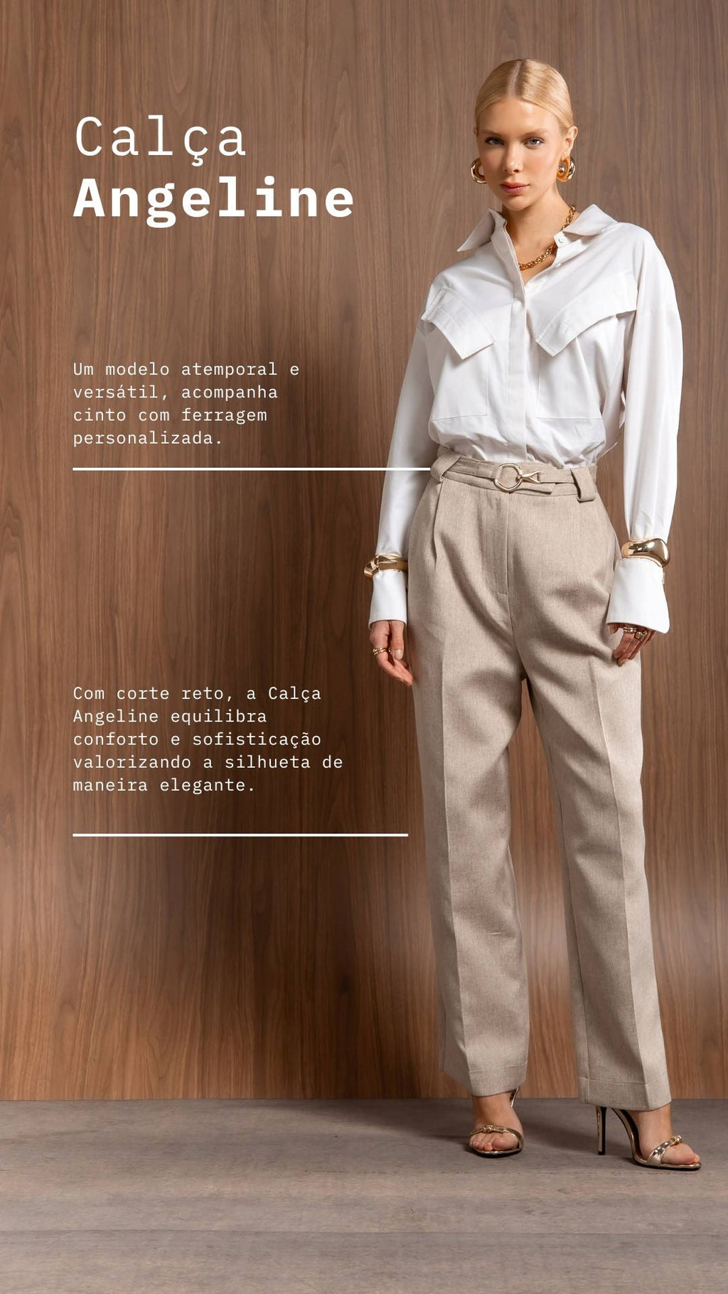 Com corte cenoura, a Calça Angeline equilibra conforto e sofisticação valorizando a silhueta de maneira elegante. Um modelo atemporal e versátil, acompanha cinto com ferragem personalizada.