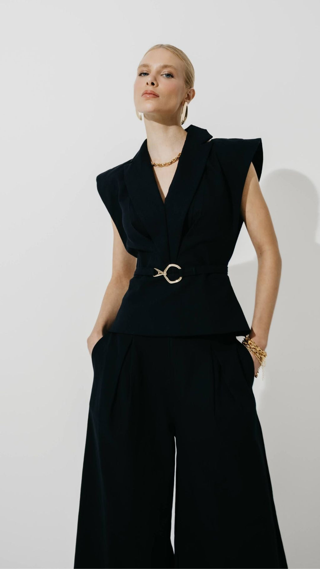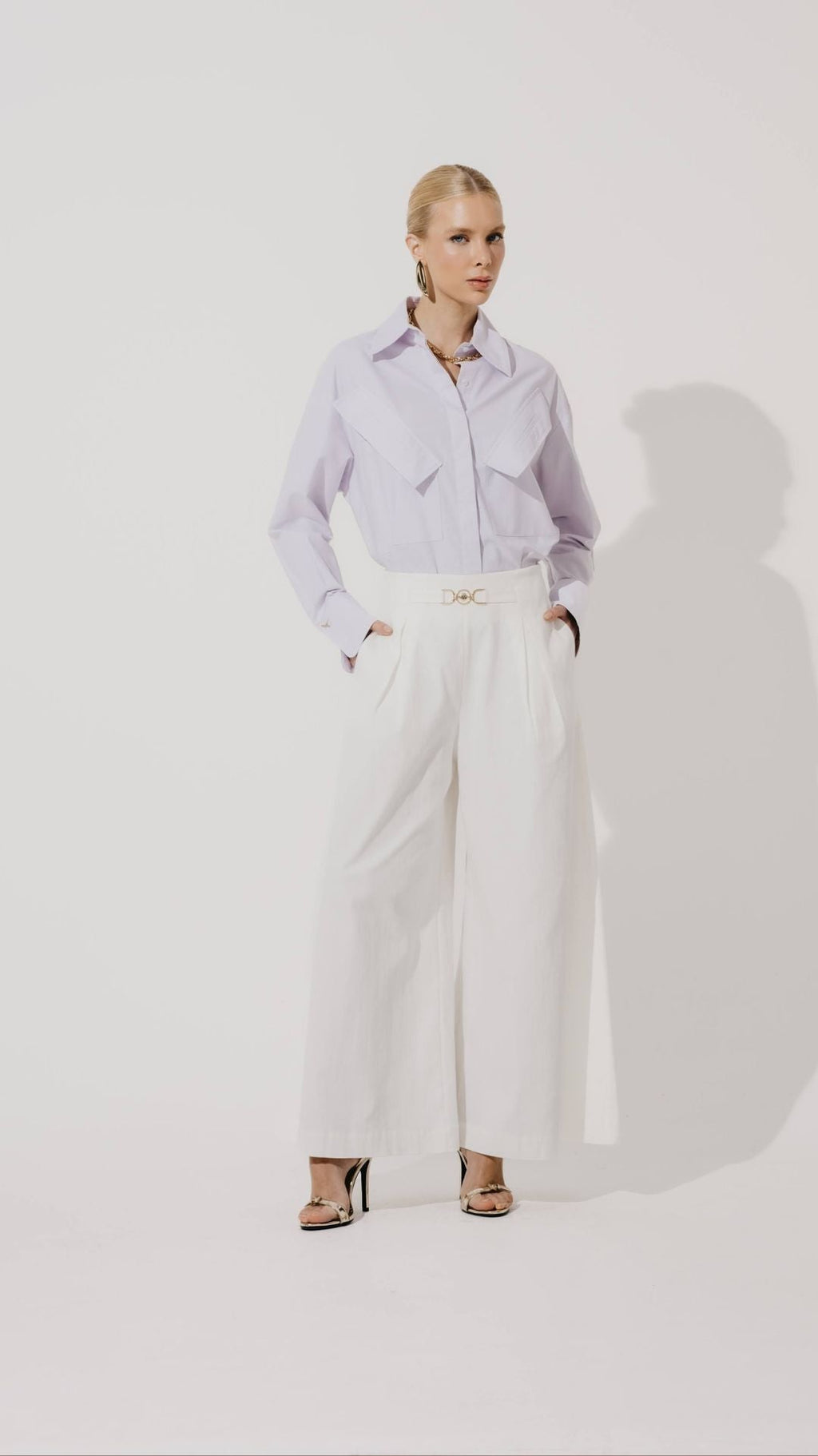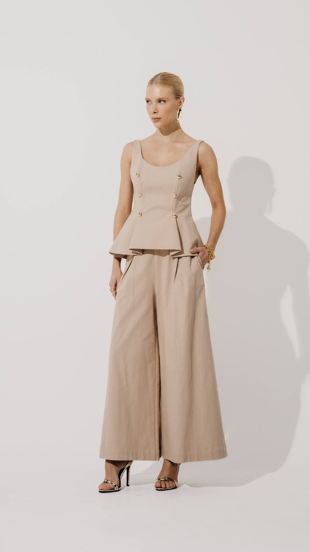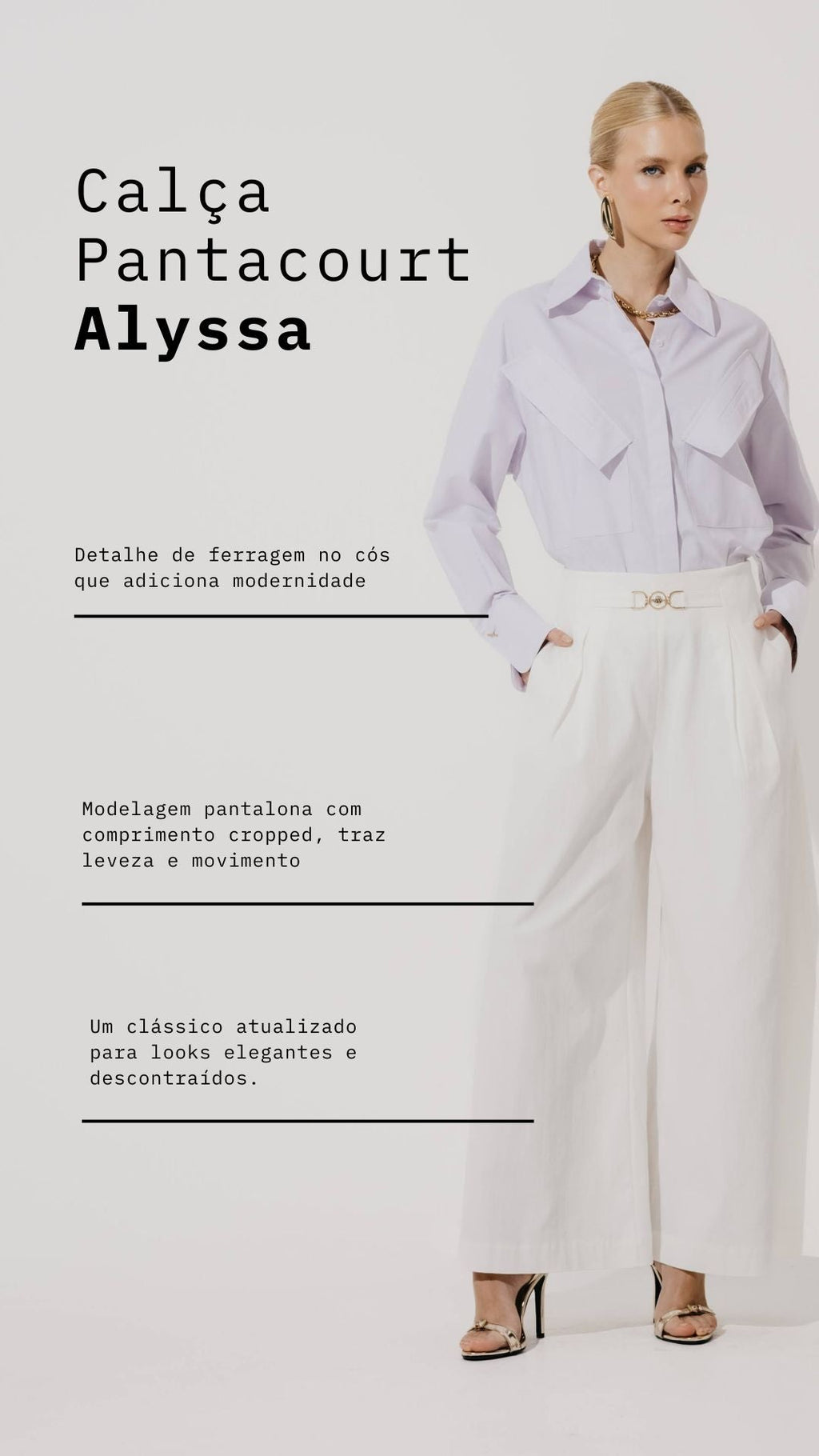 Modelagem pantalona com comprimento cropped, traz leveza e movimento, além do detalhe de ferragem no cós que adiciona modernidade. Um clássico atualizado para looks elegantes e descontraídos.
