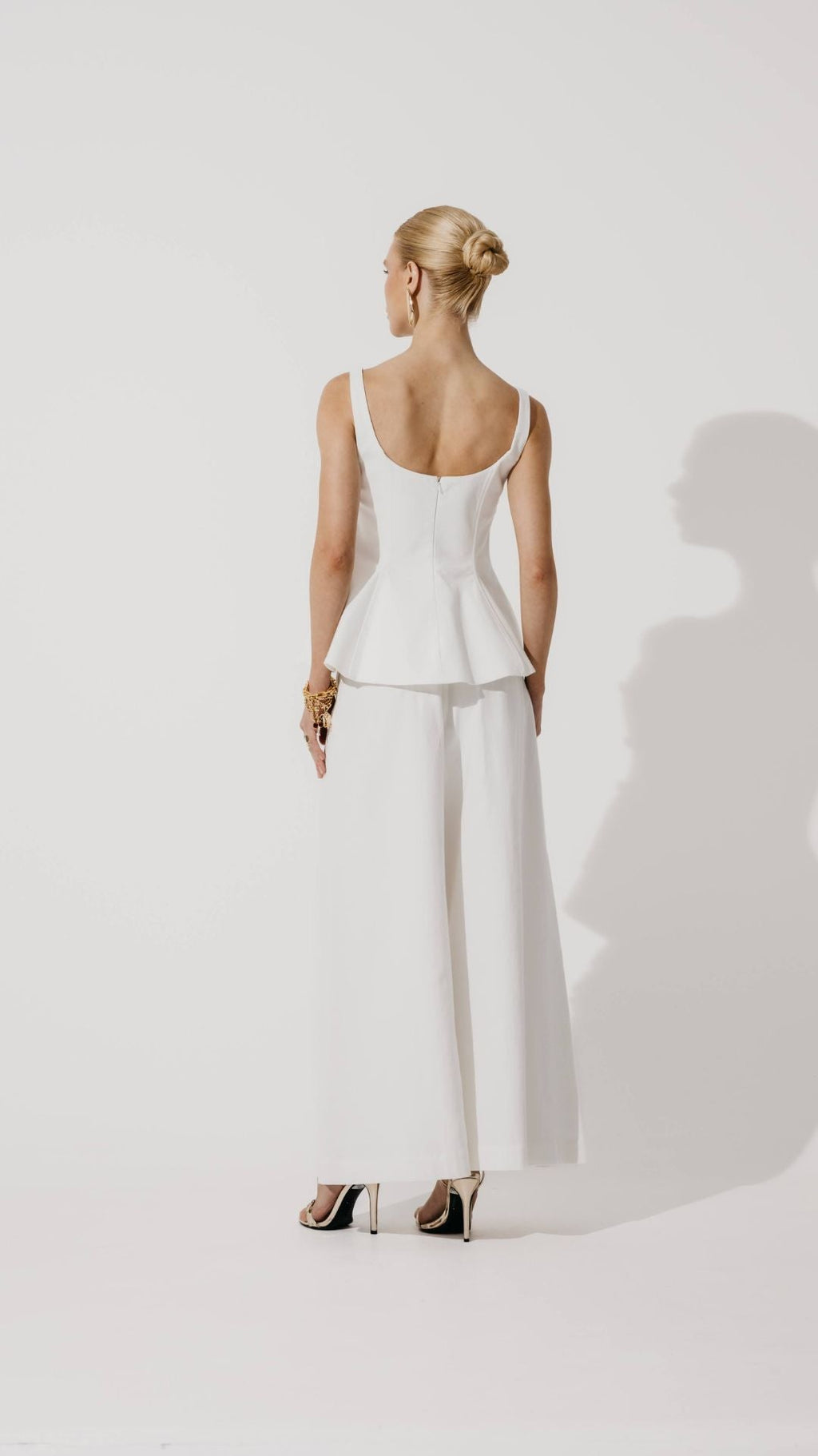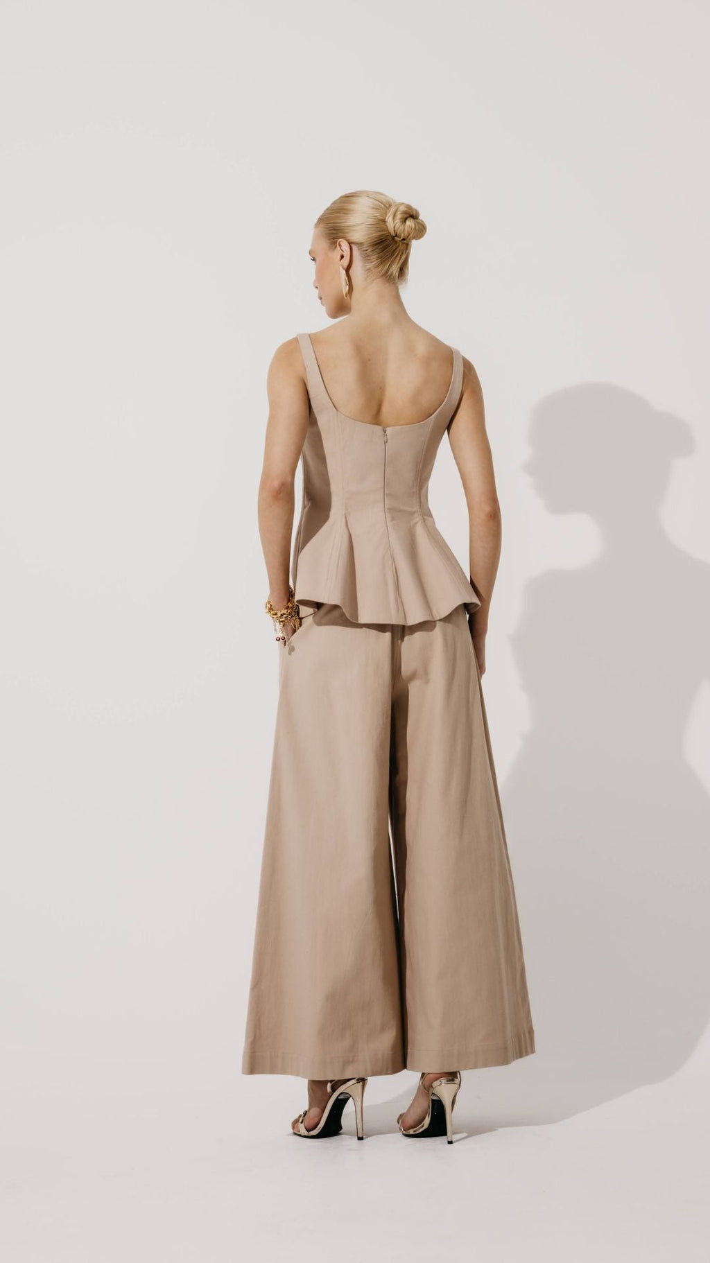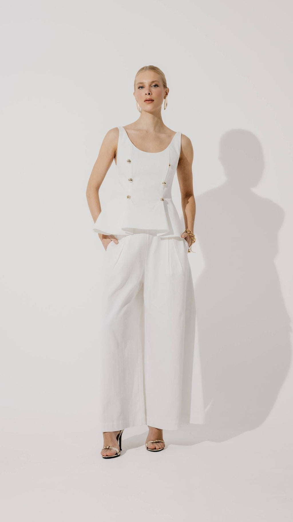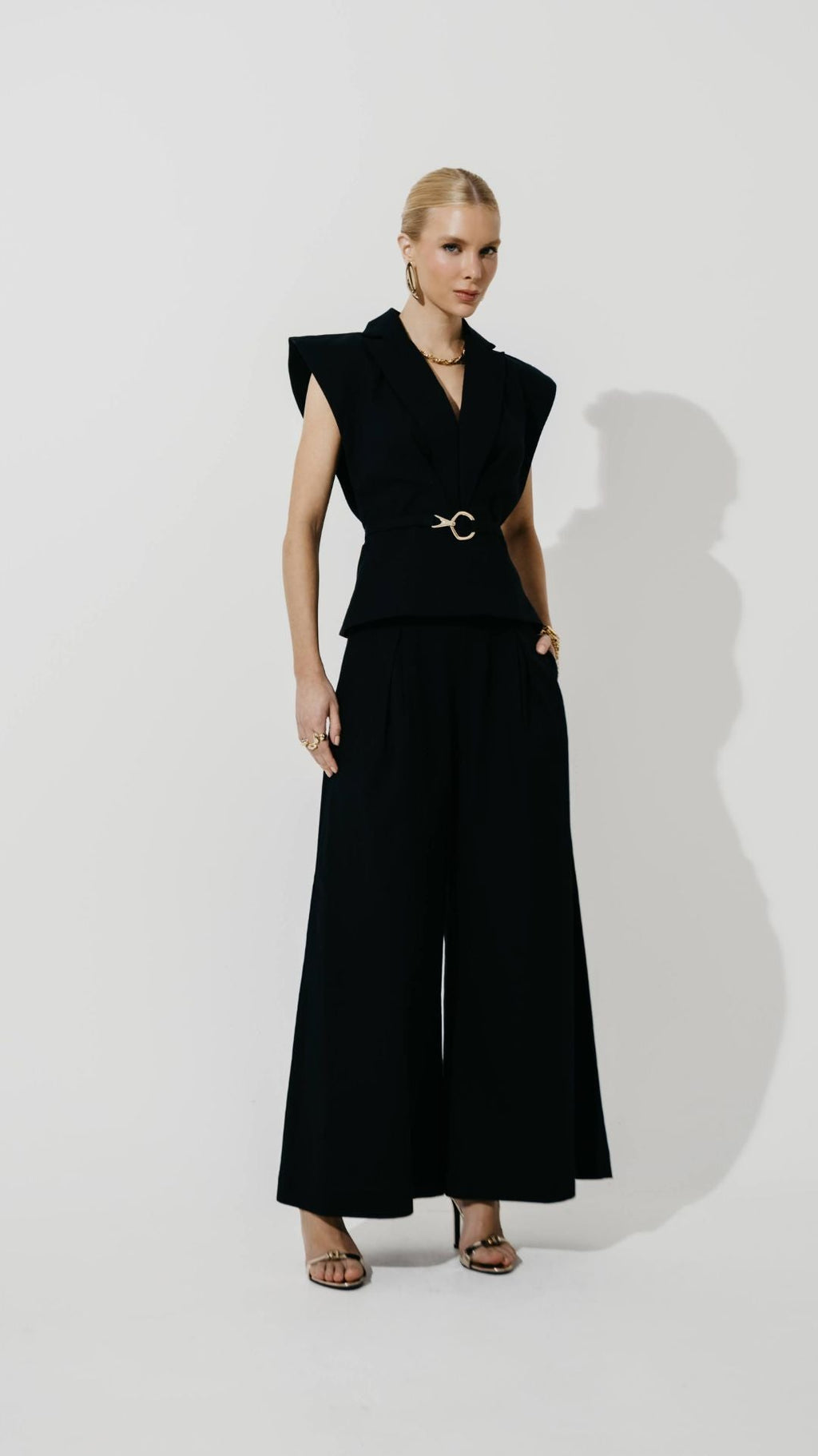 Modelagem pantalona com comprimento cropped, traz leveza e movimento, além do detalhe de ferragem no cós que adiciona modernidade. Um clássico atualizado para looks elegantes e descontraídos.