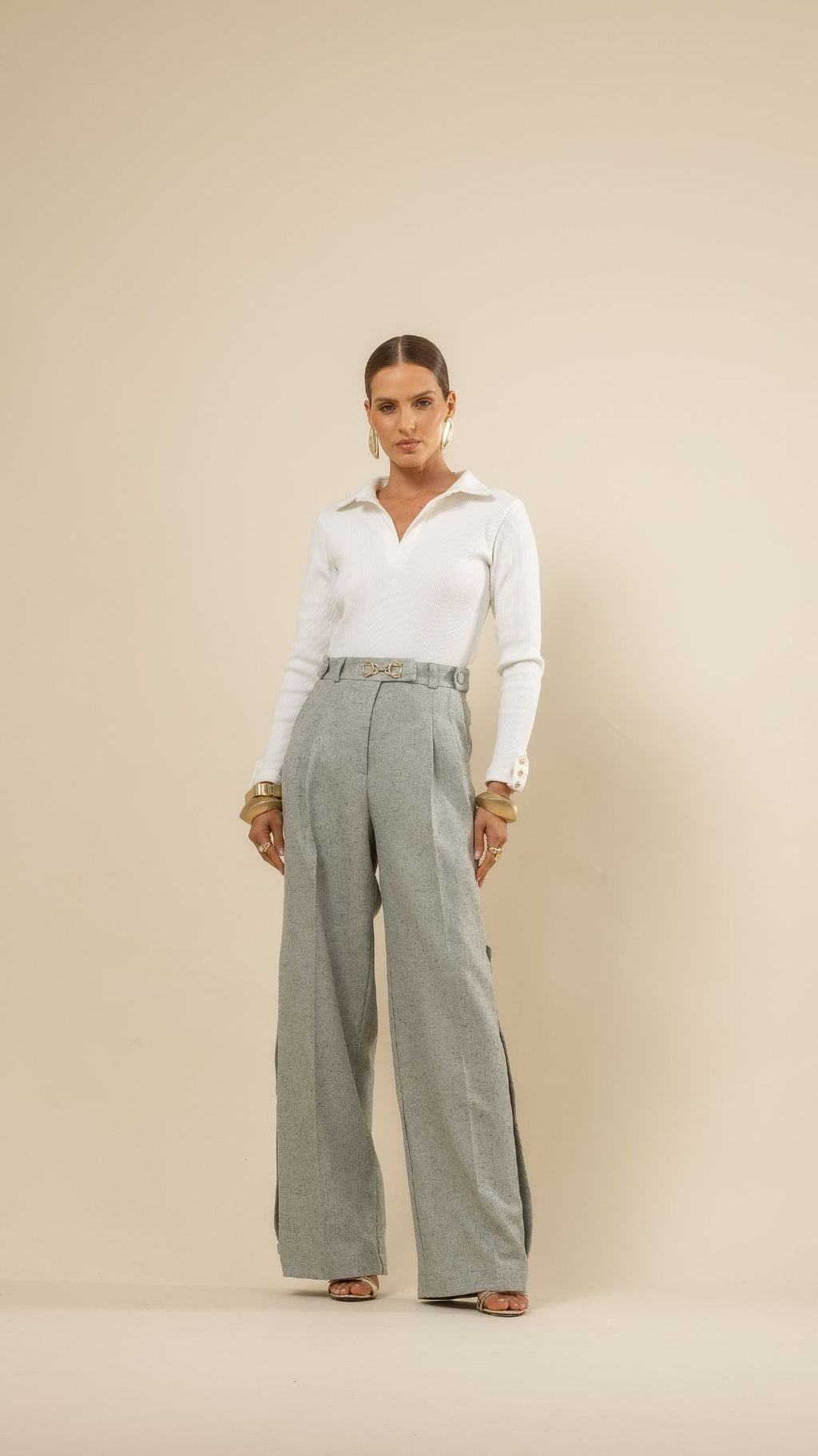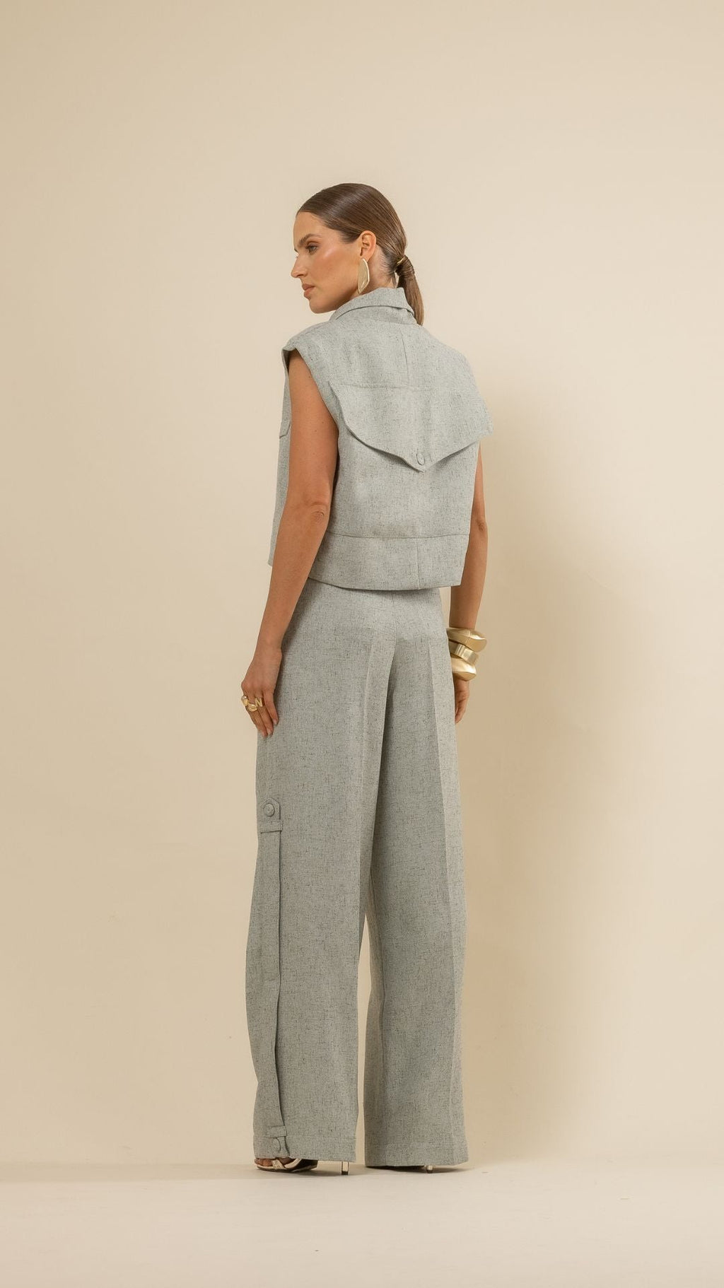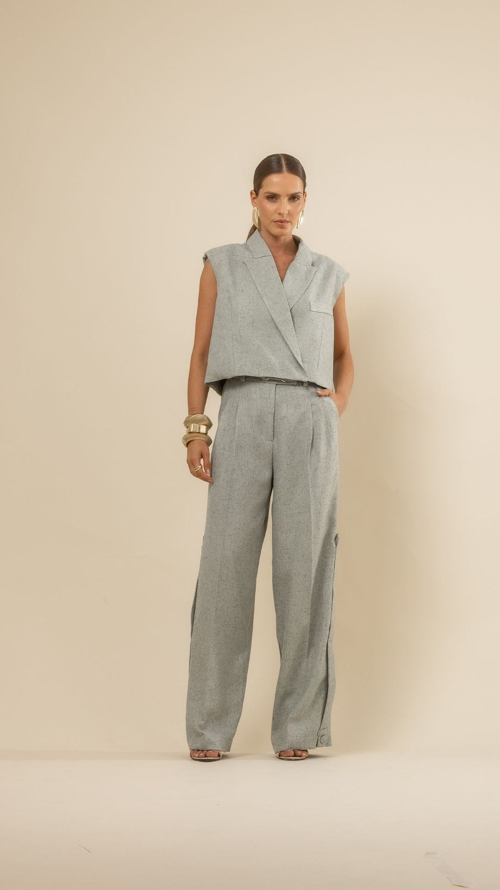 Combine a Calça Ray com o Blazer Sem Mangas Ray para um visual elegante e atual. Para um look casual sofisticado, use com camisas de seda ou camisetas estruturadas e finalize com salto bloco.
