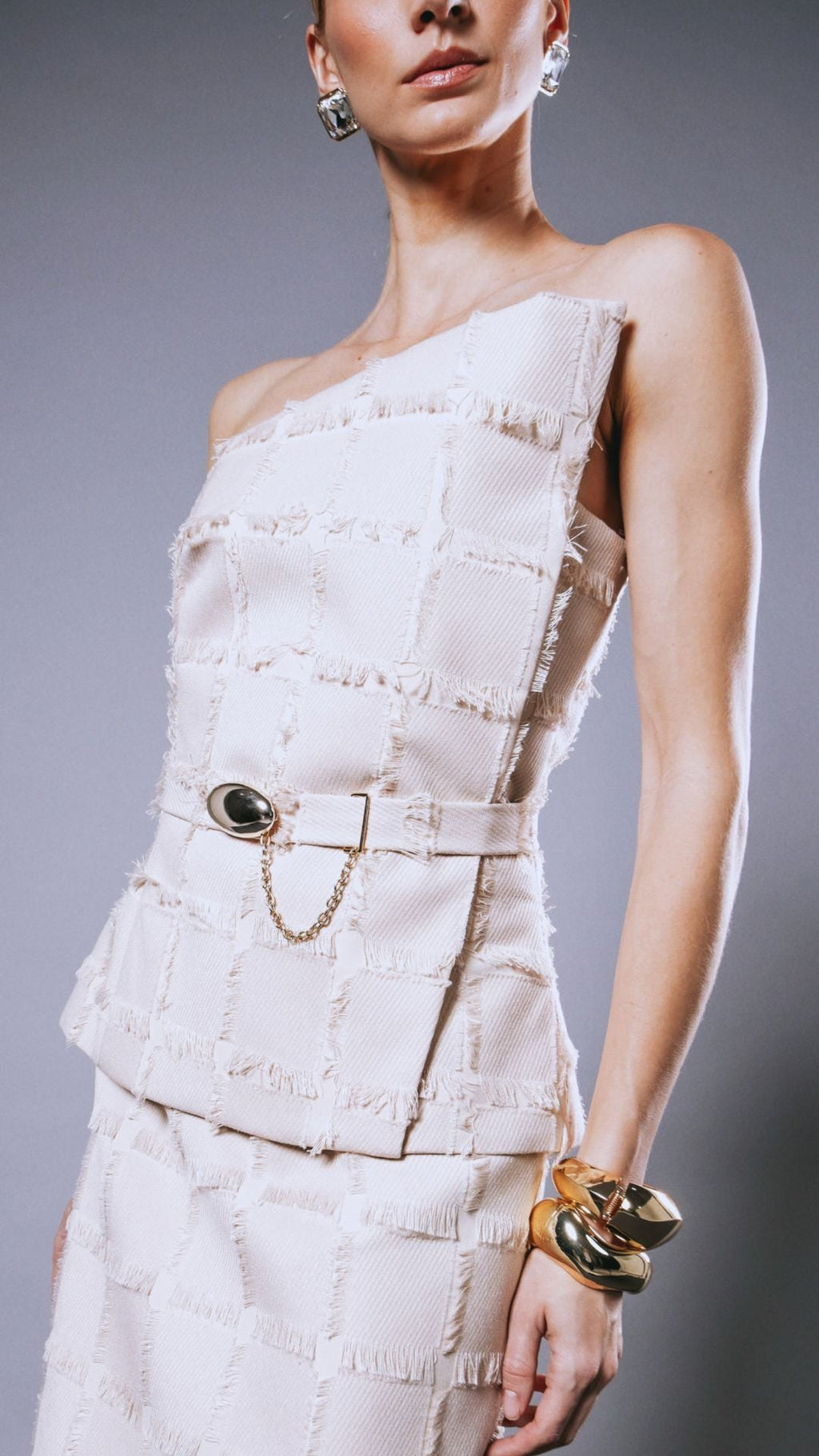 A Saia Louise traz uma proposta elegante e contemporânea, com modelagem estruturada que valoriza a silhueta. O design em alfaiataria texturizada confere sofisticação ao visual, enquanto o cinto com detalhe de ferragem exclusiva adiciona um toque moderno e imponente à peça.