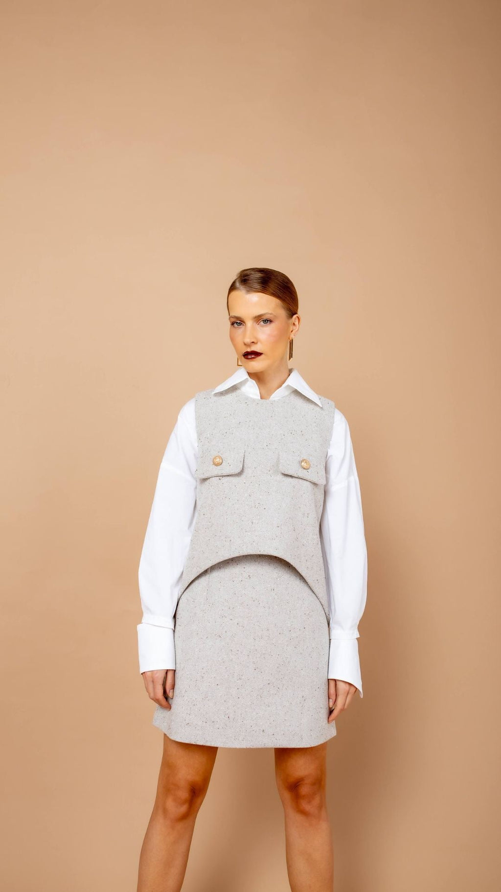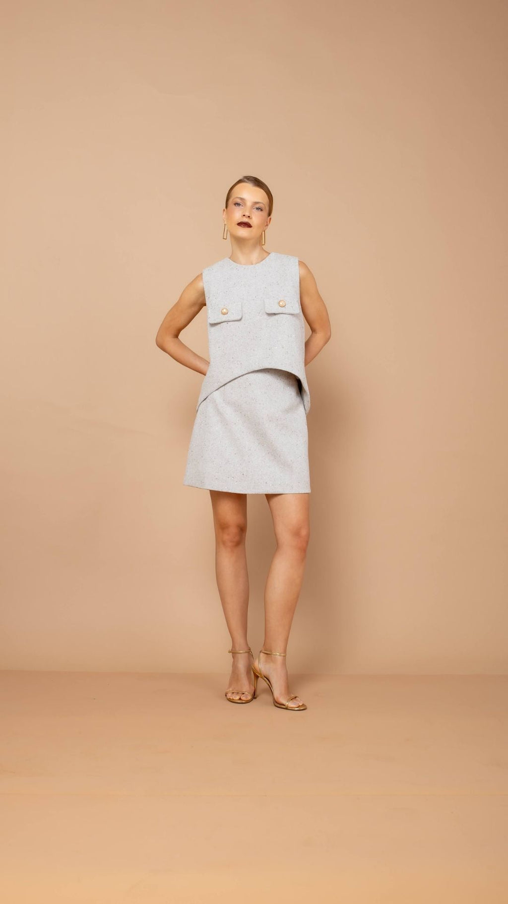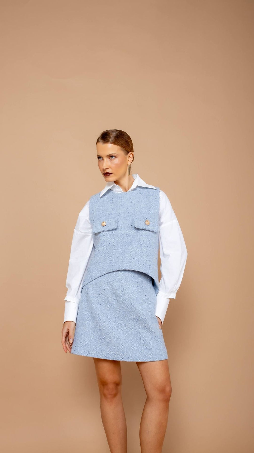 Com modelagem curta e reta, essa saia combina minimalismo e sofisticação. Uma peça versátil e atemporal. Seu tecido, um tweed com aplicação de brilhos sutis, reforça uma proposta sofisticada, perfeita para composições refinadas.