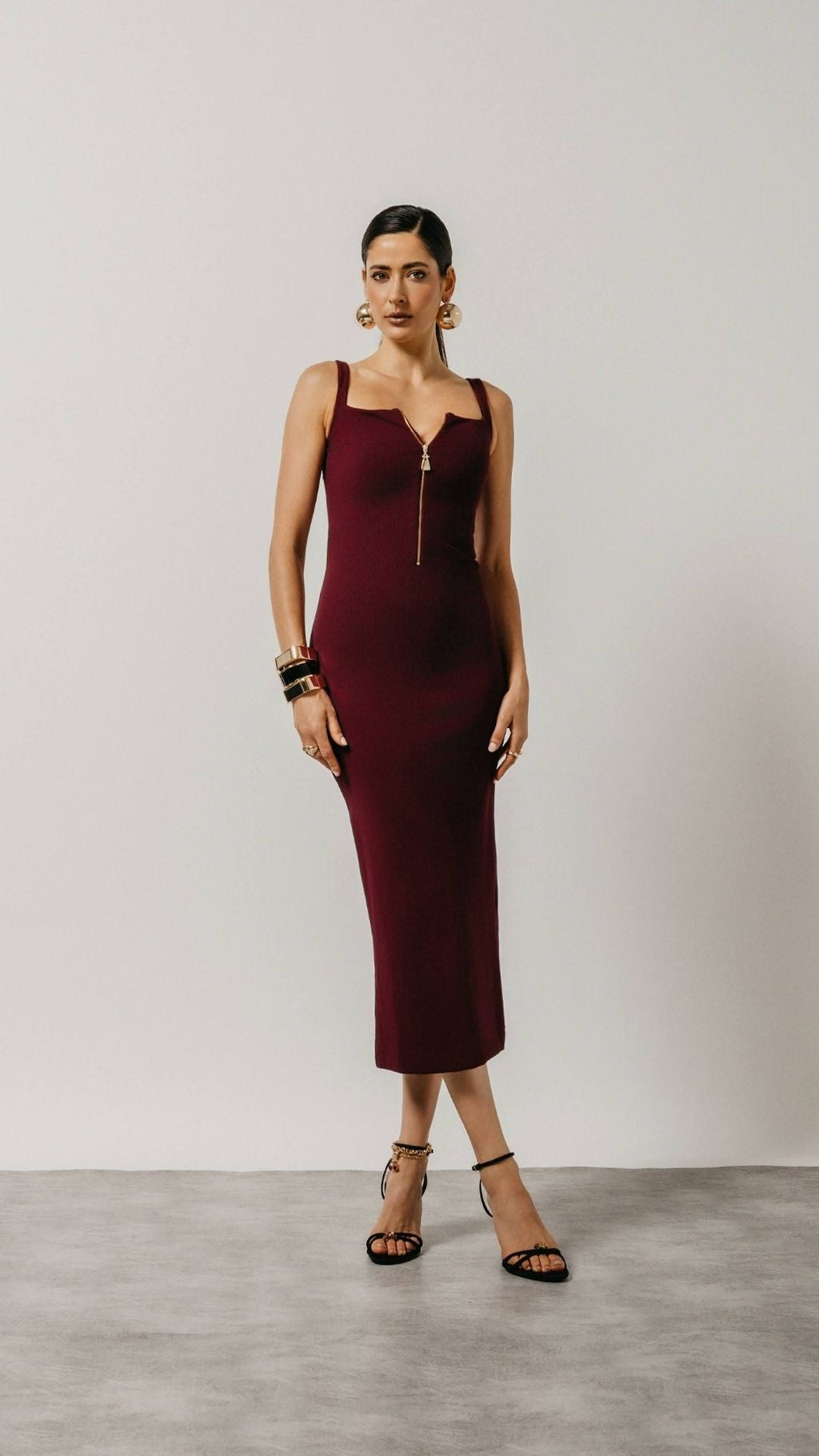 O Vestido Oly apresenta modelagem midi com silhueta justa e feminina, valorizando as curvas com elegância e sofisticação. O decote reto traz modernidade ao design, enquanto o zíper frontal adiciona um elemento funcional e contemporâneo, que reforça a estética urbana e atual da peça.